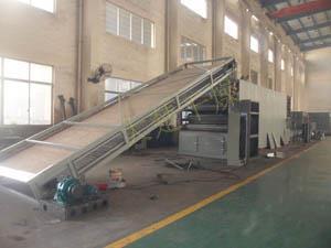 带式干燥机,资料通过进料风机被送入支螺旋焚烧炉内旋浮焚烧,发生的炉气经除尘调制,并与空气恰当混合,进入带式干燥机窑散热器内。窑的顶端设有轴流风机,发生的风量横向穿过材堆,加热木材。